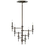 Bearing distinctive elements of art deco design, the Omega chandelier features customizable arms that radiate from the central body, allowing for unique configurations. Machine turned accents adorn the boboches with clean lined and modernist aesthetics. 21.5 inches x 24.25 inches (6) X 60 Watt Candelabra bulbs not included Comes with (3) x 16 inch, (2) x 12 inch, (2) x 8 inch rods Constructed from iron Oil rubbed bronze finish on iron